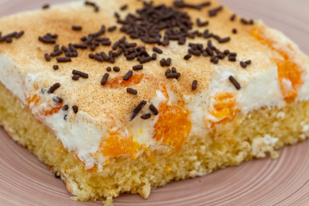 Die Mandarinen-Schmand-Creme gleichmäßig auf dem ausgekühlten Boden verteilen. Den Kuchen für mindestens 1–2 Stunden in den Kühlschrank stellen, bis die Creme fest geworden ist. -